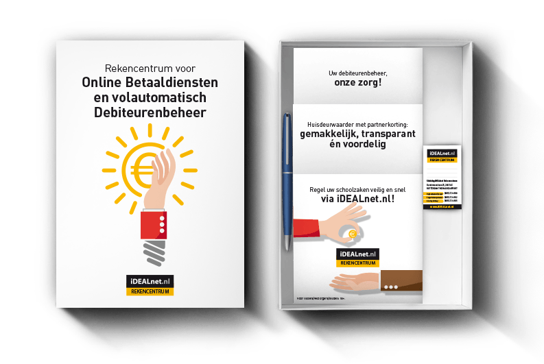 Deze brievenbusdoos kan via de post opgestuurd worden naar geïnteresseerden. Het foldermateriaal kan aangepast zodat de informatie van de online betaaldienst iDEALnet.nl specifiek gericht is naar de ontvanger. Samen met de ruimte voor het visitekaartje en een iDEALnet-pen is het een echte blikvanger!